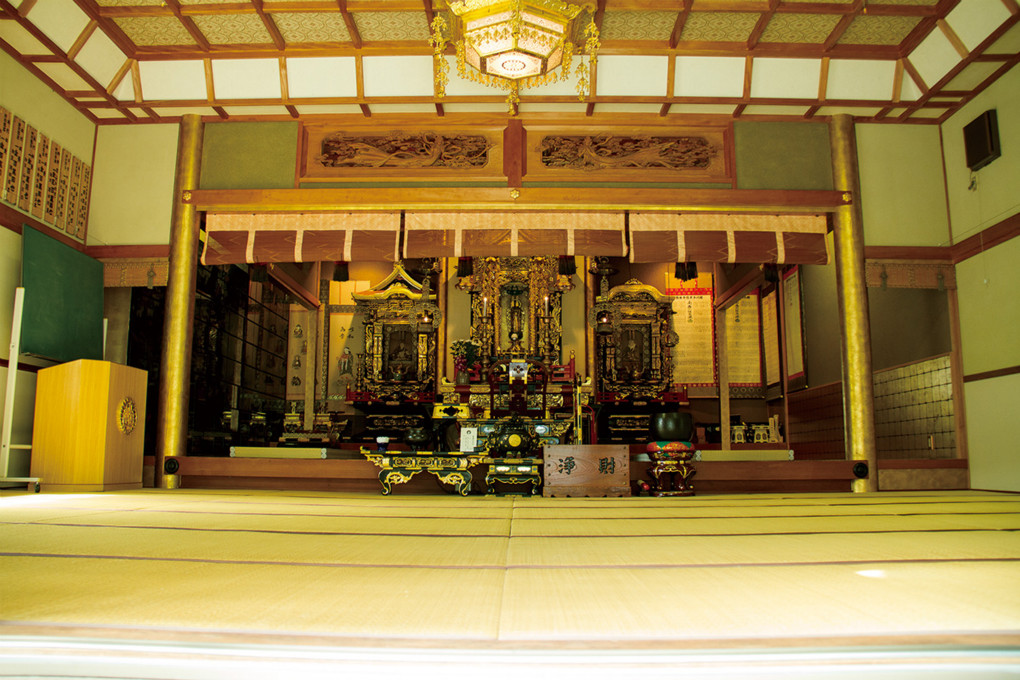 ご本堂は、阿弥陀如来(南無阿弥陀仏)をおまつりしております。宗祖、親鸞聖人のみ教えを伝え、人と人が寄り合い、寄り添いながら“いのちの言葉”を聞く癒しの空間として皆様とともに歩んで行きたいと願っております。